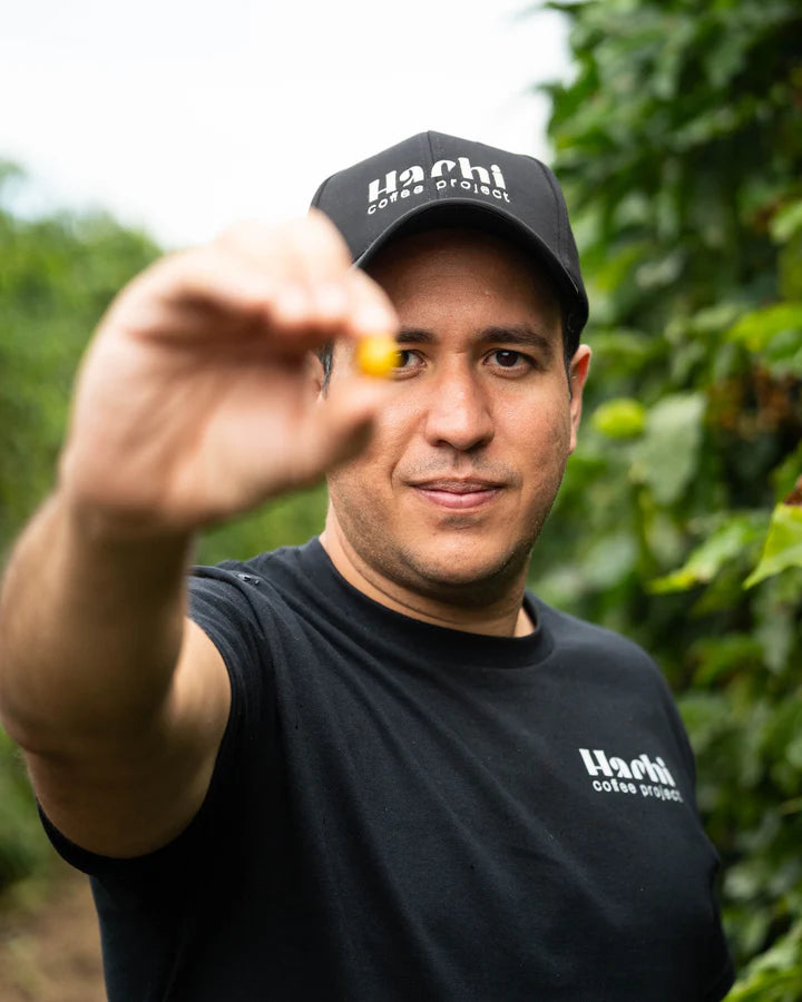 Hachi est un projet qui combine biotechnologies et agronomie traditionnelle pour valoriser le potentiel du Gesha et d'autres variétés exotiques, tout en privilégiant des pratiques durables face au changement climatique. Ce projet est né de la collaboration de Diego Bermudez, pionnier de la fermentation contrôlée en Colombie, et du célèbre Allan Hartmann. À travers ce projet, Diego et Allan utilisent les biotechnologies pour améliorer la résilience des plantes, leur apporter une meilleure nutrition et réduire l'utilisation de pesticides, tout en continuant à produire à plus grande échelle.