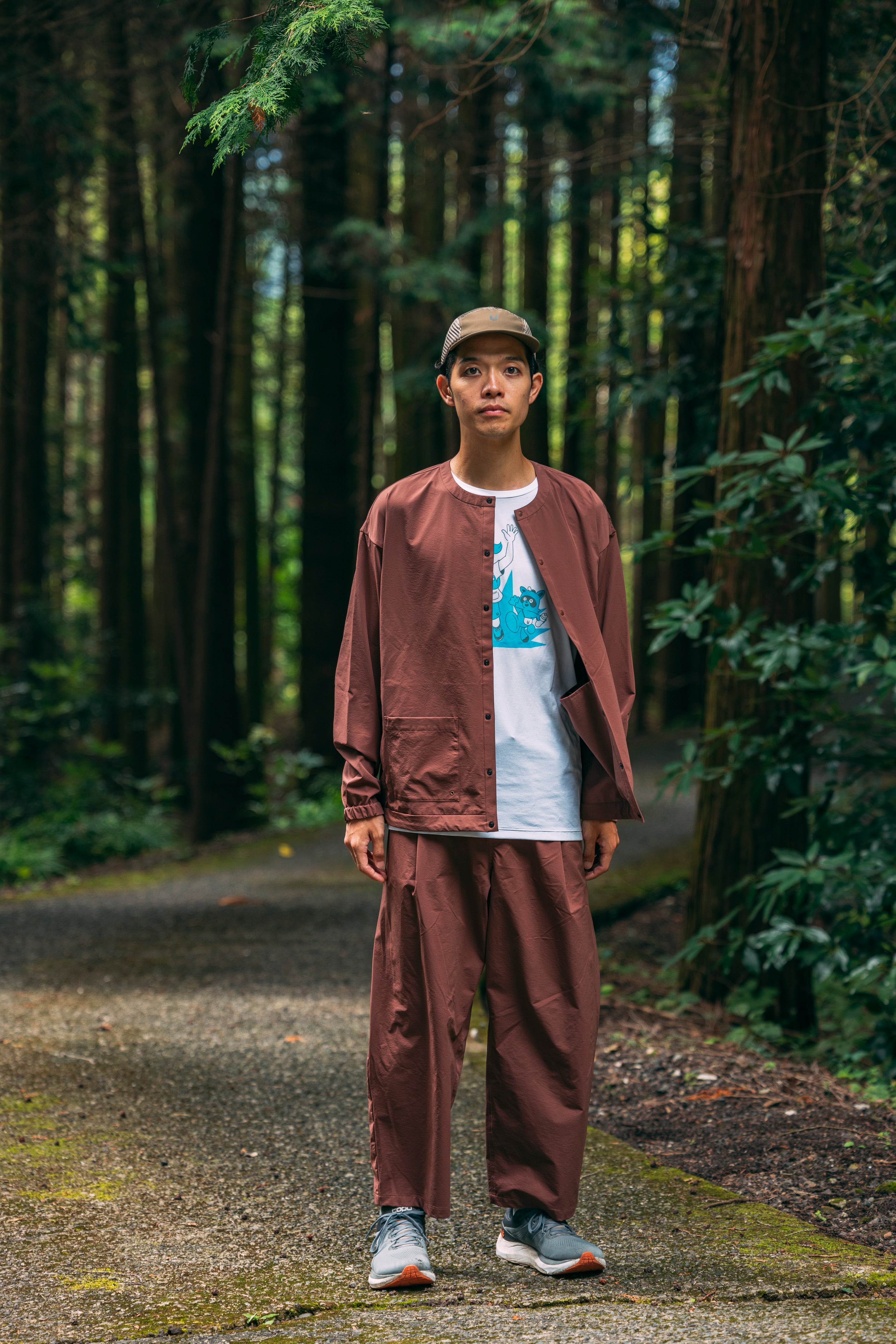 The material used is a new 100% polyester material whose fibers have a springy shape (although they don't look like it). The main characteristic of this material is that it is both lightweight and stretchy. It is very comfortable. It also has a water-repellent finish that resists stains and light rain. Furthermore, the texture has a natural feel reminiscent of cotton, and it fits easily into both the mountains and the city.